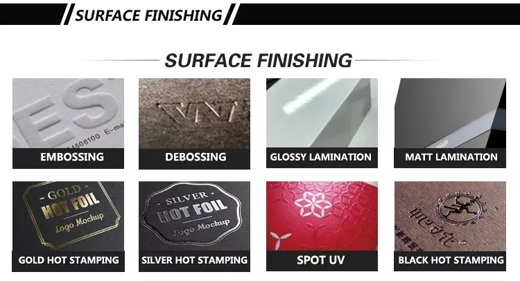 Logo type | 1) Glossy/Matte lamination 2) Complete or Spot UV 3) Embossing and Debossing 4) Gold or silver foil stamping 5) Varnishing Logo type | |||